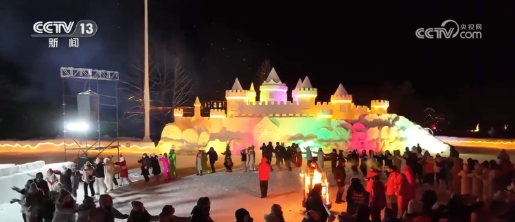 夜晚,漠河北极村灯火通明,栩栩如生的雪雕闪烁着各种色彩。来自世界各地的游客聚集在小广场上,手牵手跳舞,捕捉浪漫的烟花。为满足滑雪爱好者的需求,当地滑雪场今年首次开放夜间滑雪,增添了新线索。